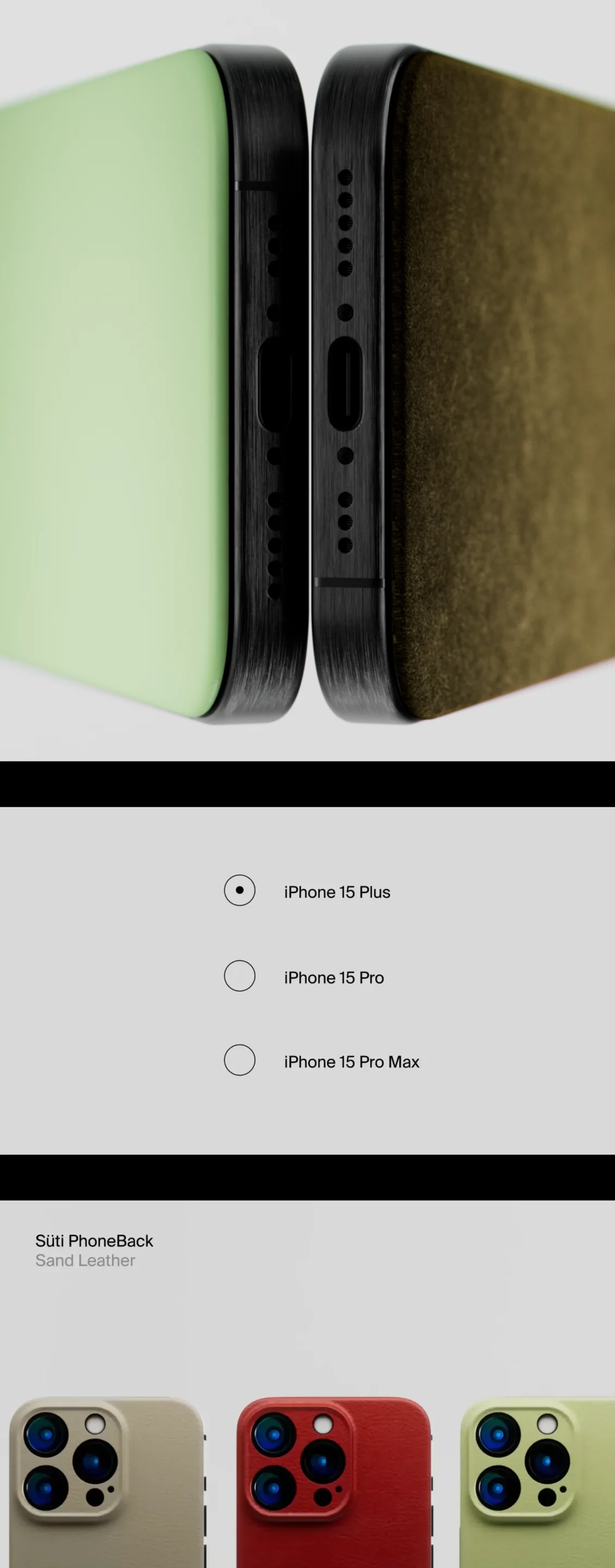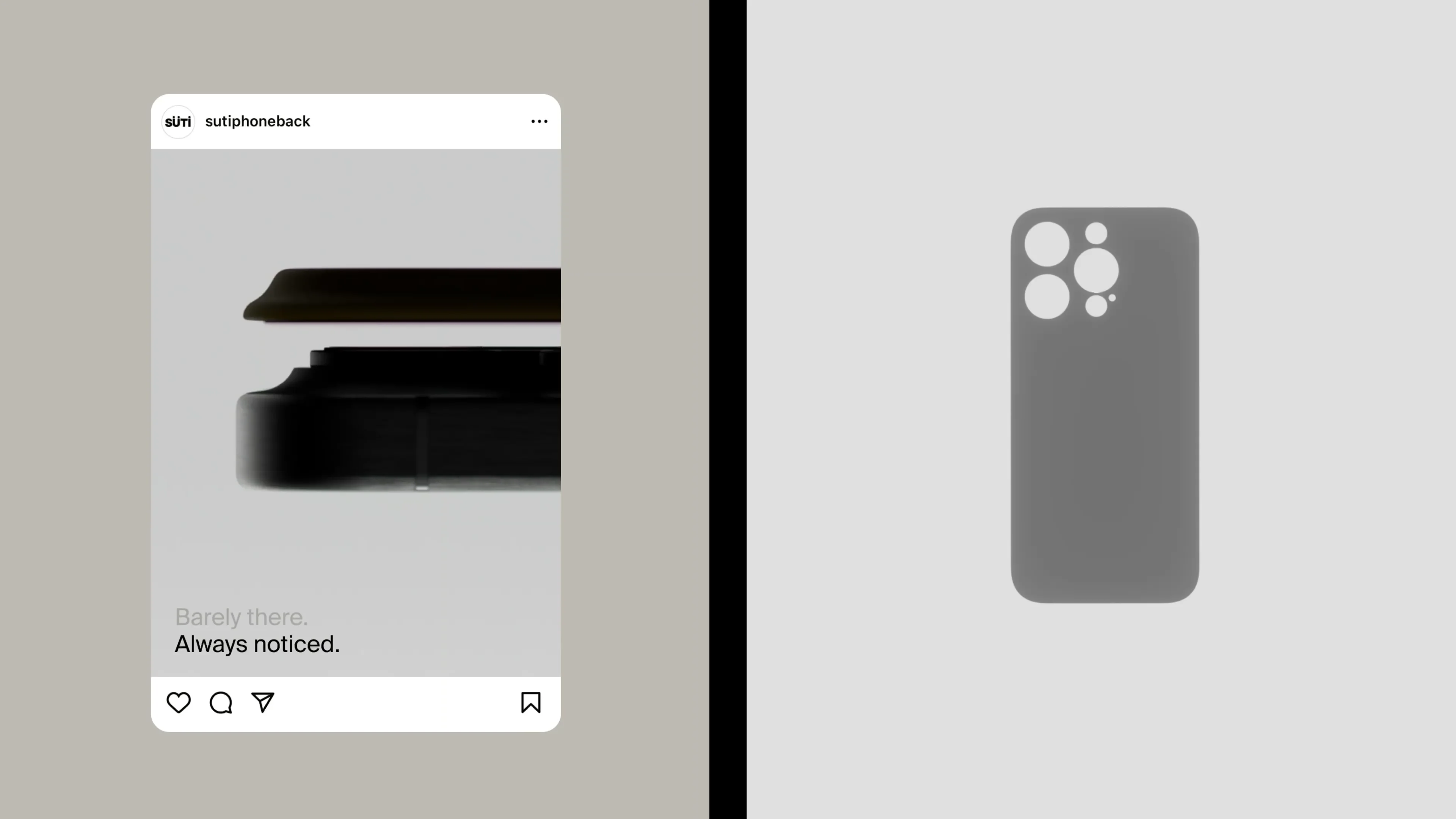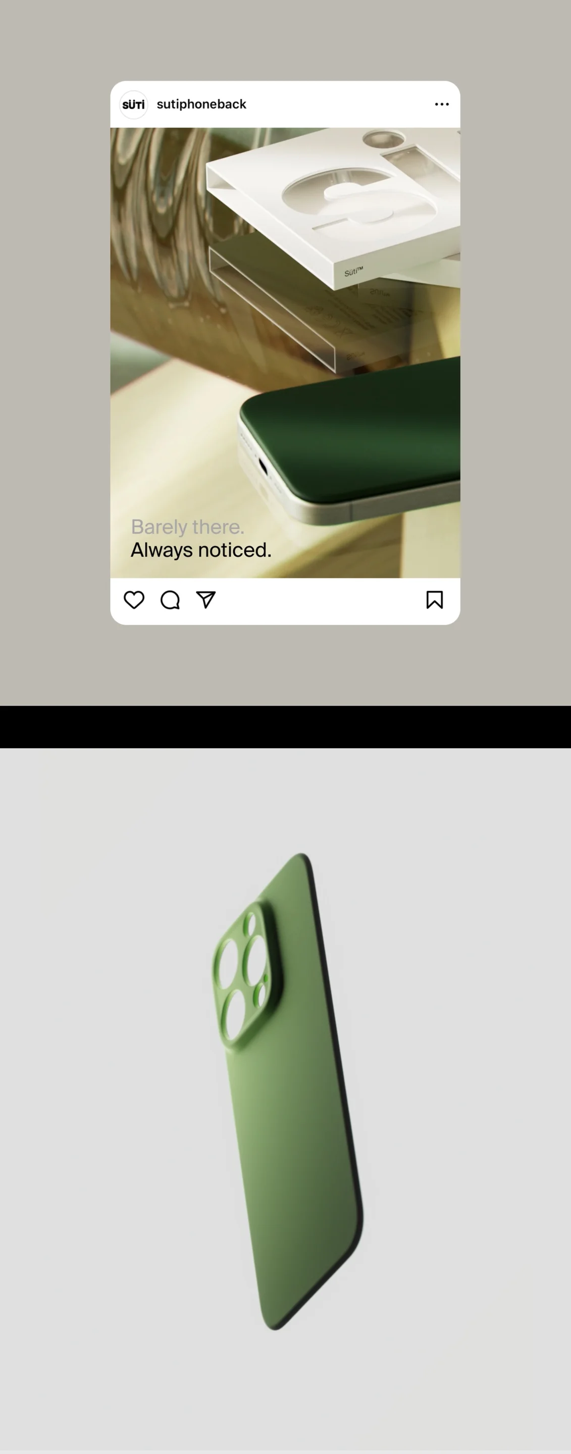 From the start, the audience was clear - people that value the design of the iPhone, and find phone cases a clumsy addition to a beautiful product. For the name, we landed on “Süti” on day 1 - it’s the Swahili word for “suit” - a nod to the product being a stylish way to dress your phone. However, as it’s not a case, we also needed a new product descriptor - thus ‘the Phoneback’ was born. Both a descriptor & CTA, it became the base for the tagline, “Ditch the case. Get your PhoneBack.”